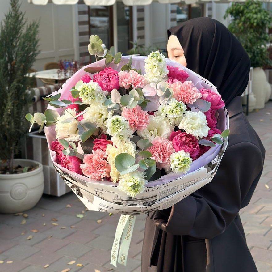 Нежный евро-букет из стойких диантусов, свежих лизиантусов и ароматных маттиол