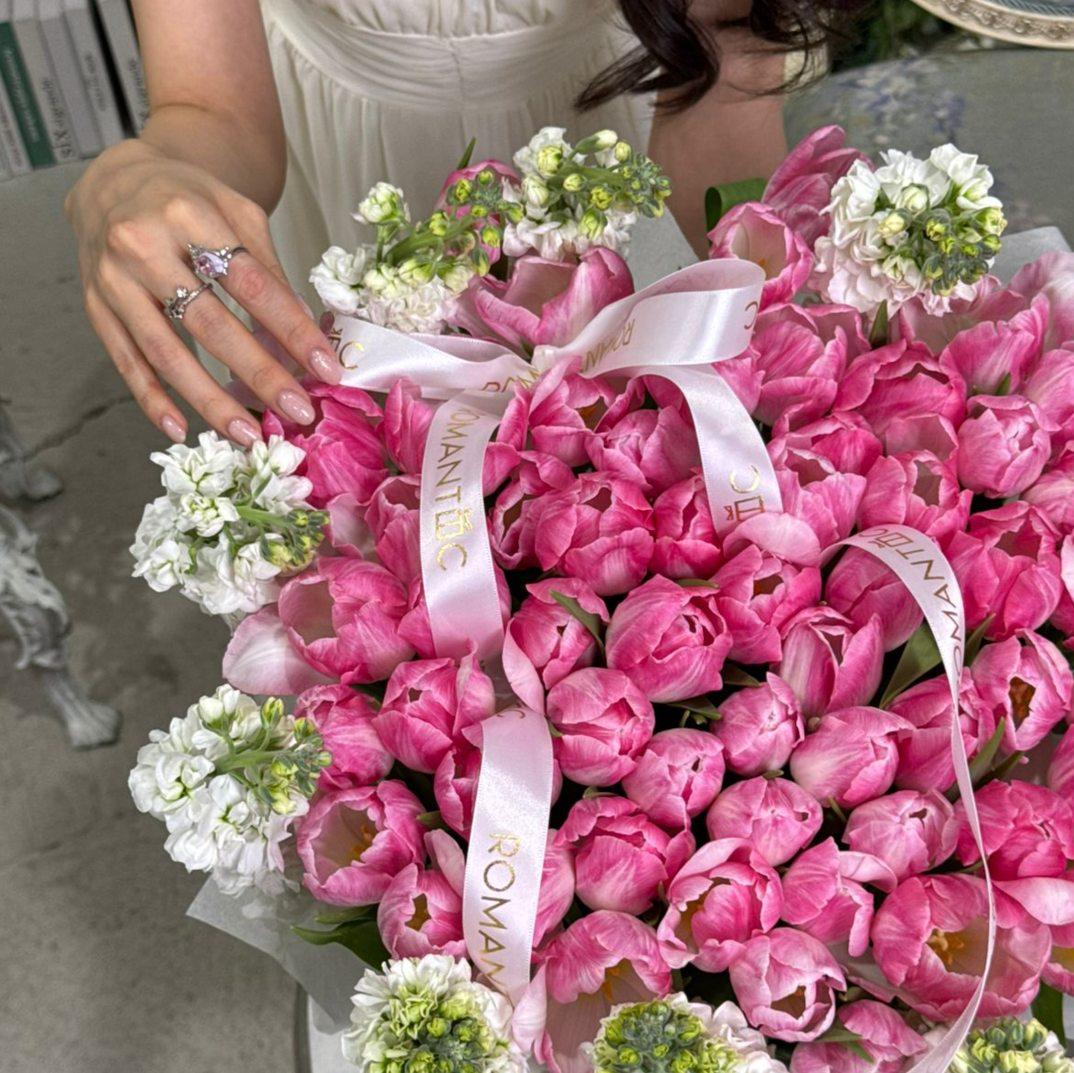 Нежный дуэт из тюльпанов и ароматных маттиол