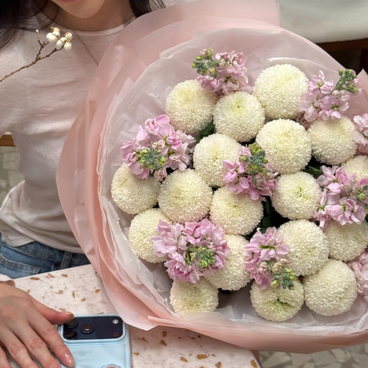 Дуэт из хризантемы-момоко и ароматных маттиол