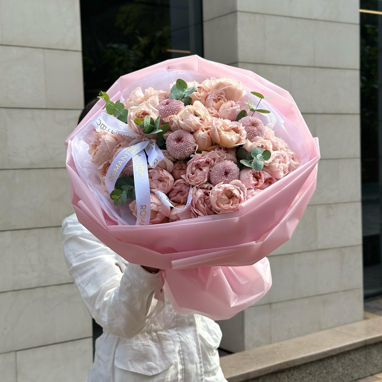 Воздушный букет из пионовидных кустовых роз, хризантем и свежего эвкалипта