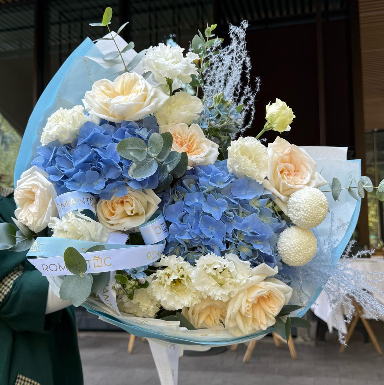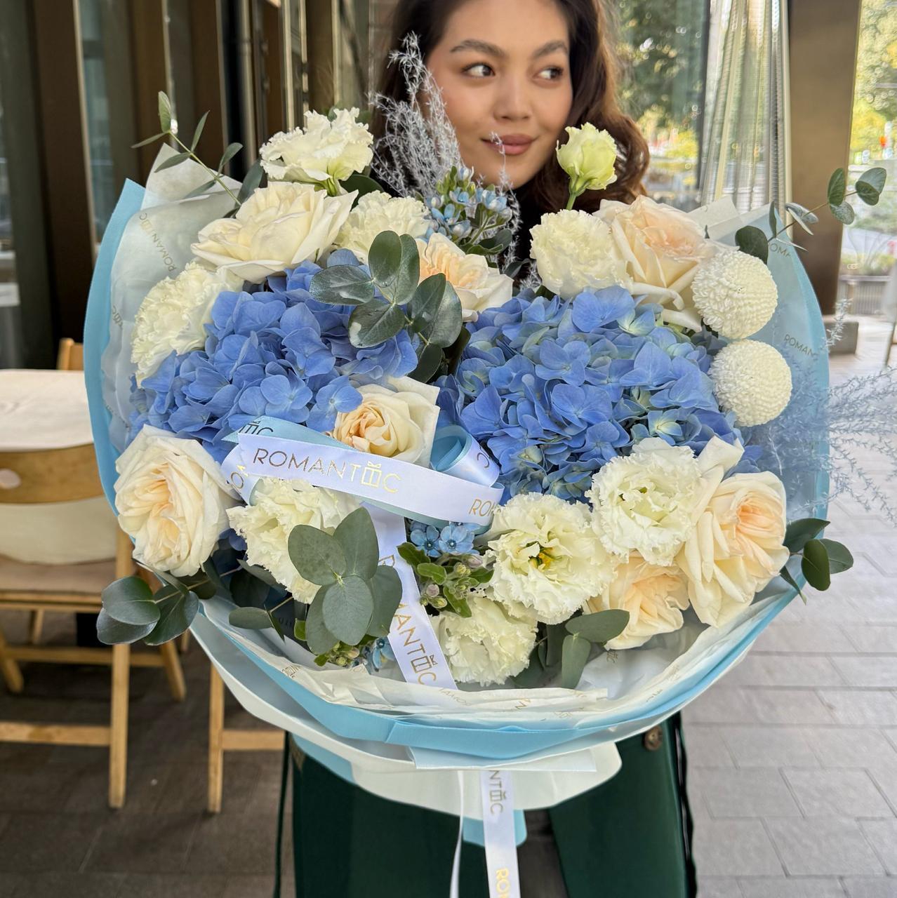 Нежный букет из кремовых роз с добавлением стойких лизиантусов и синих гортензий